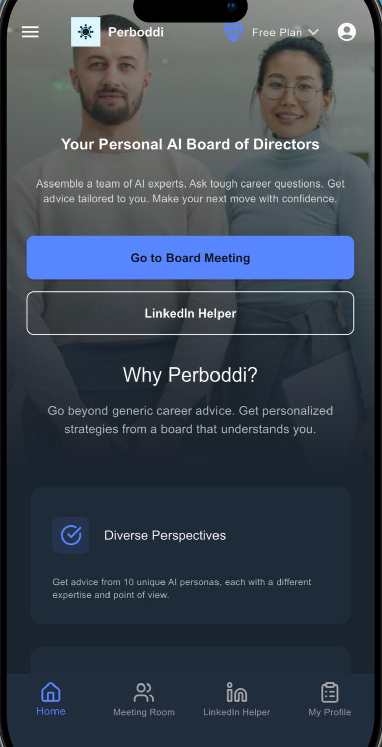 perboddi gives you eight expert personas, each with their own style, perspective and expertise. All available 24/7, and ready to tailor their advice to your needs.No scheduling, no small talk, just the advice you need, when you need it.