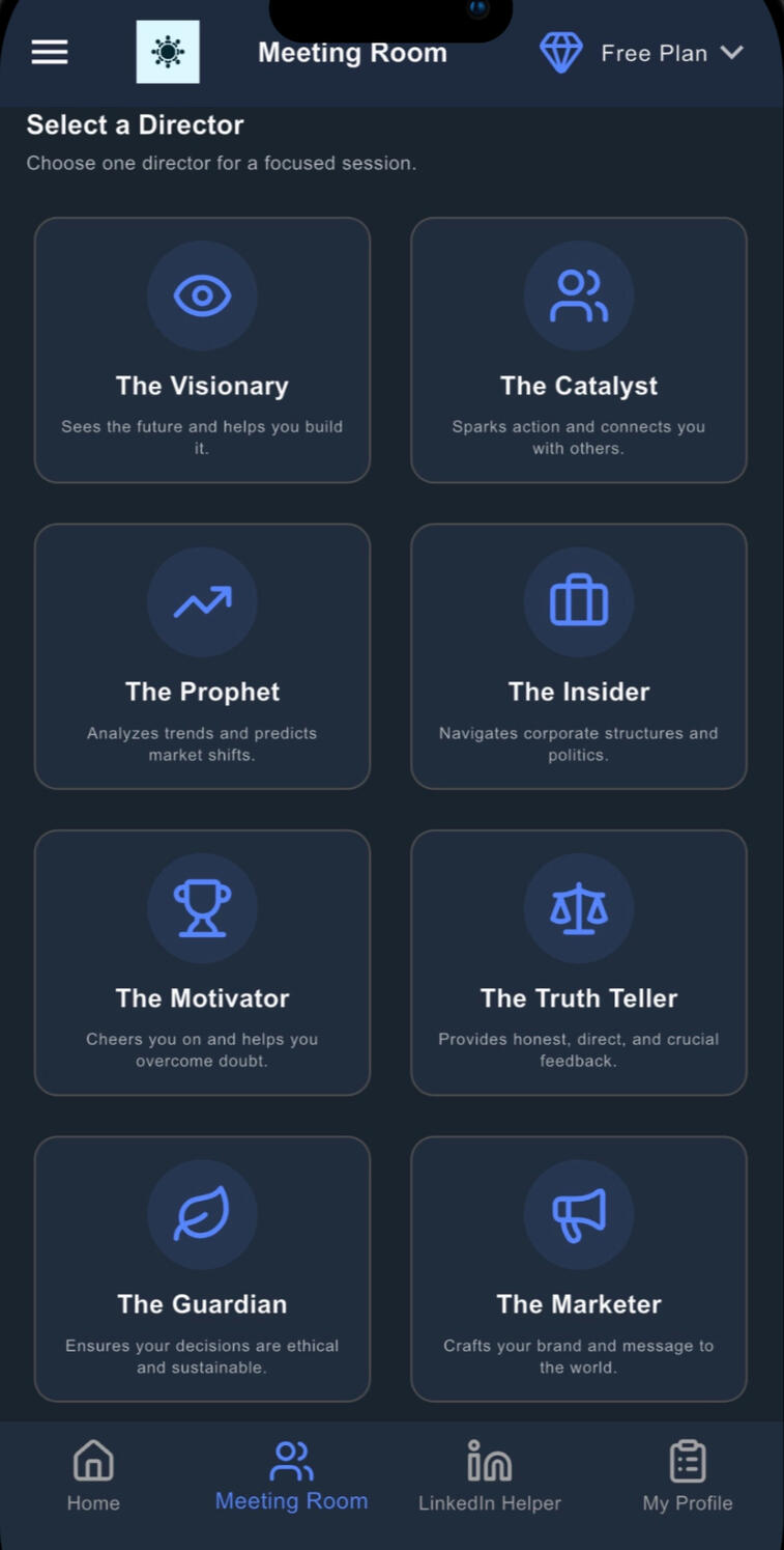 Eight expert personas, each with their own style, perspective, and expertise.All available 24/7, and tailored to your needs.No scheduling, no small talk, just the advice you need, when you need it.
